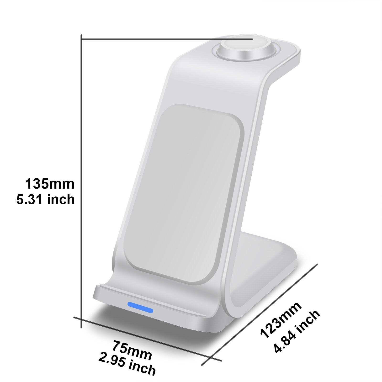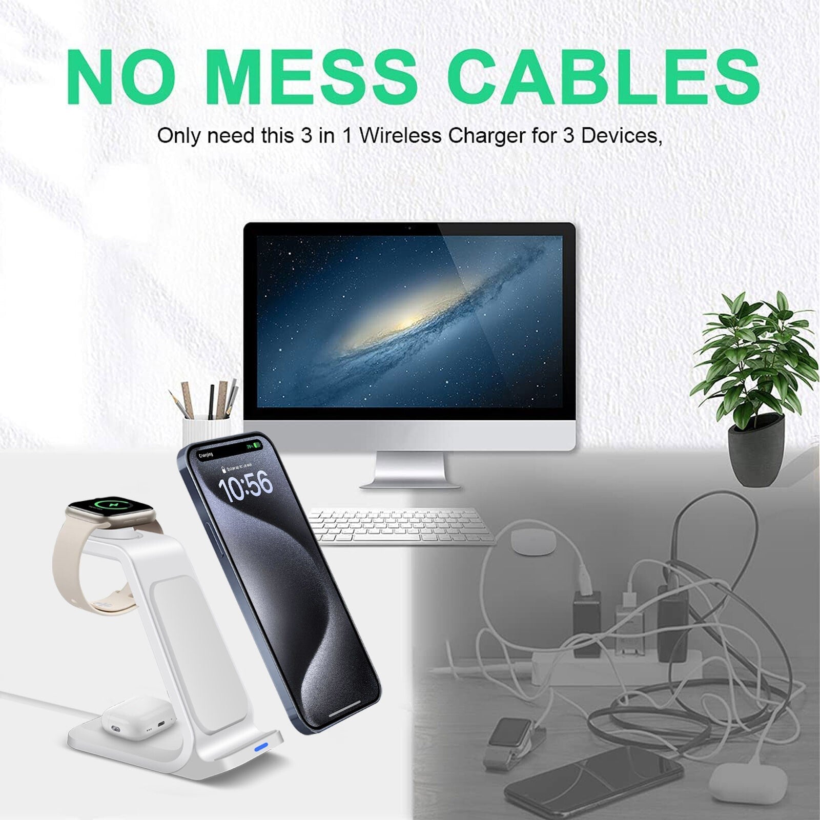 Kompatibel mit allen Smartphones mit kabelloser Ladefunktion, von Uhren bis hin zu Ohrhörern und mehr. Der kabellose Ladeständer ermöglicht das gleichzeitige Laden von drei Geräten. Schluss mit lästigem Kabelsalat! Sparen Sie sich die Zeit zum Entwirren und sparen Sie Platz auf dem Schreibtisch für ein ordentliches Erscheinungsbild.